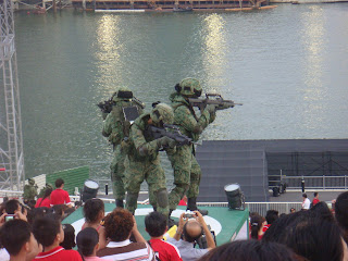 Watched, and the things inside the bags, I only like the heart shape thing! Got red & white light. But I don't know why some people have green or blue lights. Im jealous! The green very nice. :D And of cos the cute little Mr.bean 'drum stick' thinggy damn cute! Hahaha :D Got one part is when they shoot the don't know what thing, damn loud one. Then bomb, after awhile bomb again, then after awhile bomb again. Everytime they bomb, i get scared one time. Walao!